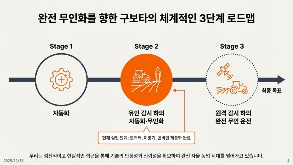 기술은 한 번에 완성되지 않습니다. 쿠보타처럼 기술적 실현 가능성과 시장의 신뢰를 동시에 얻을 수 있는 치밀한 단계별 발전 전략(3단계 로드맵)이 필요합니다.