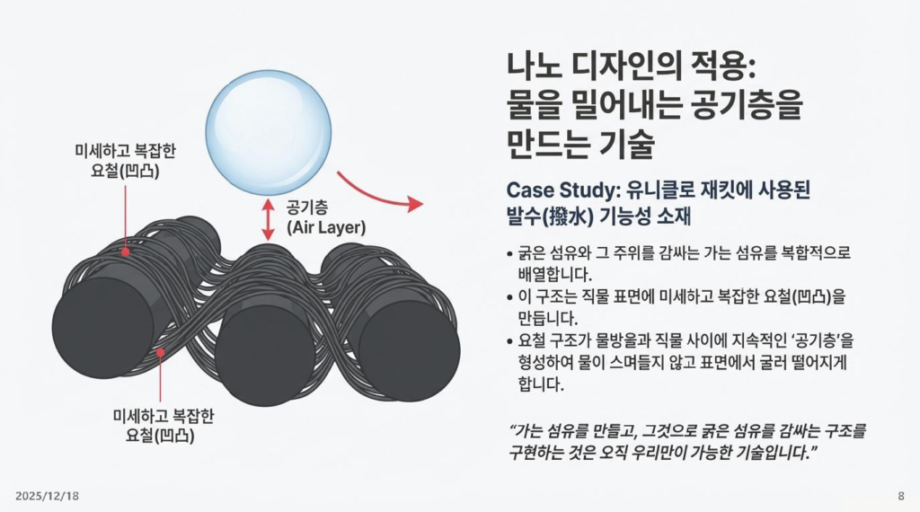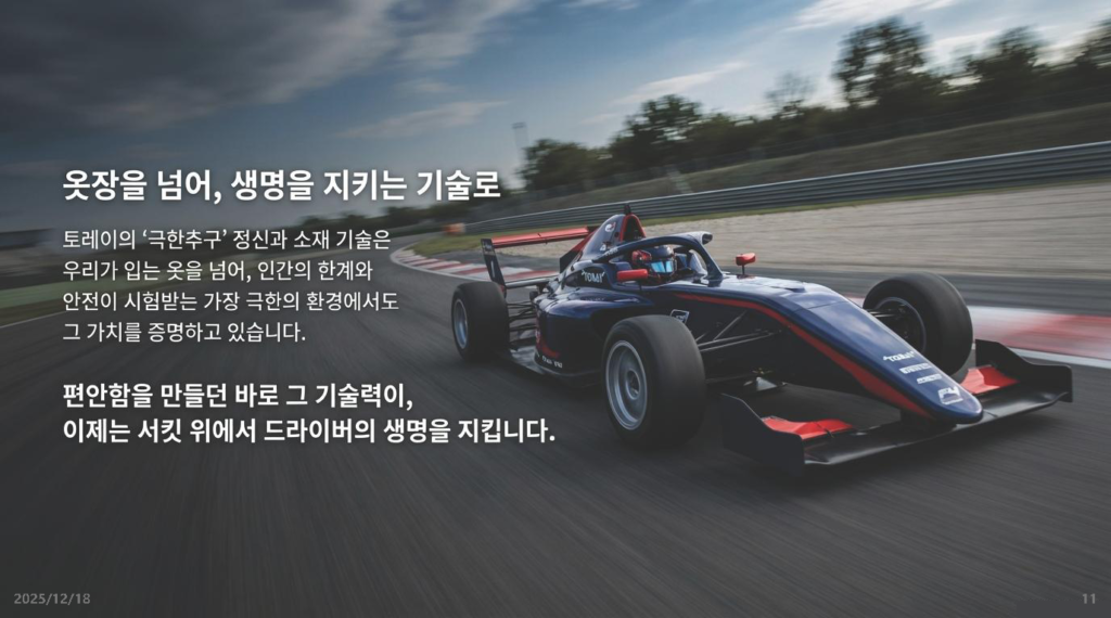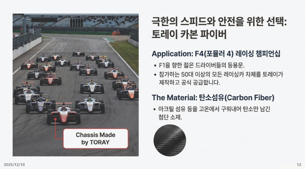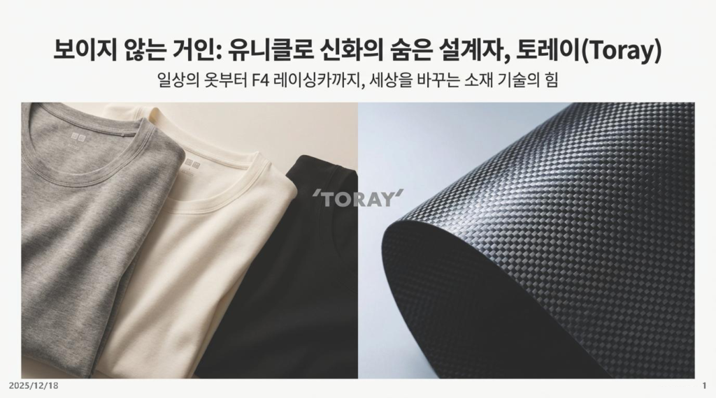- 시사점: 토레이의 기술은 내복(히트텍)부터 F1 레이싱카(Carbon fiber)까지 적용됩니다. 잘 만든 원천 소재 기술 하나가 패션, 자동차, 항공 우주 등 산업의 경계를 허물며 엄청난 가치를 창출함을 보여줍니다.