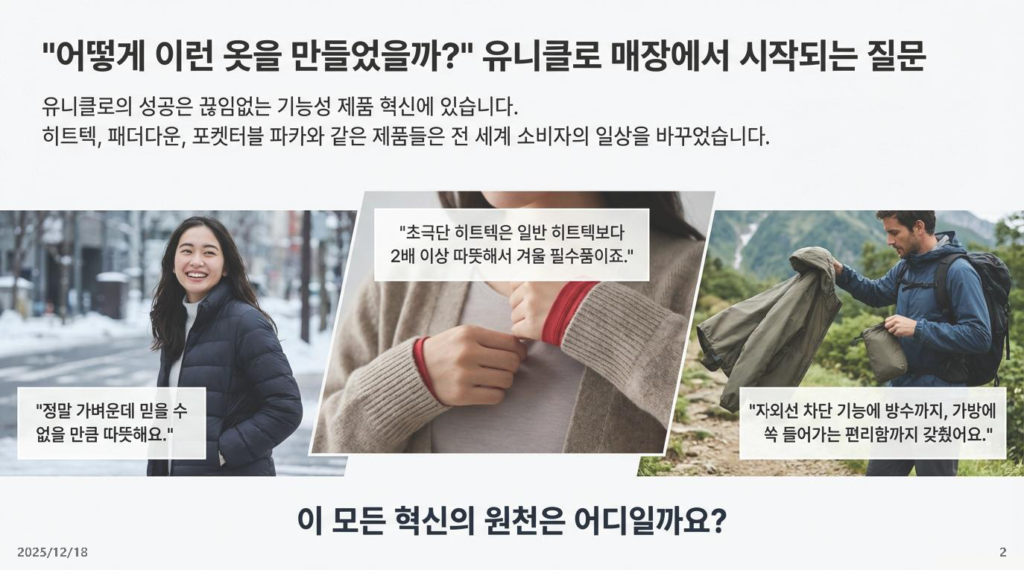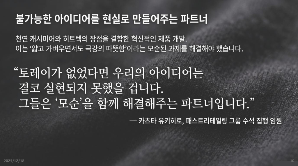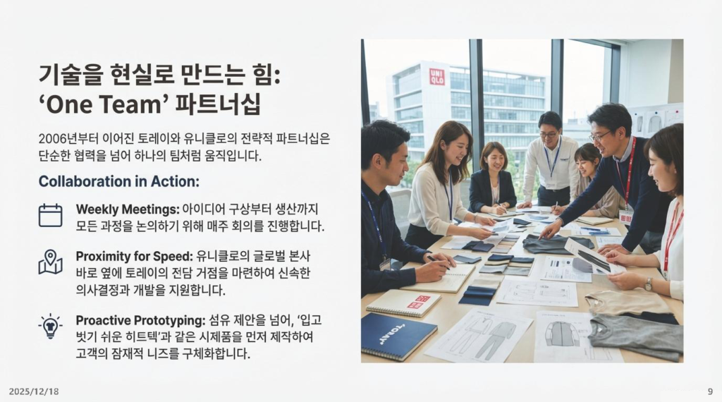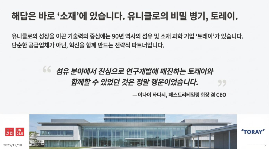 - 시사점: 토레이와 유니클로는 단순한 납품 관계가 아닙니다. 기획 단계부터 매주 머리를 맞대고 고민하는 ‘운명 공동체’입니다. 한국의 대기업과 중소기업도 “시키는 대로 만들어라” 식의 수직적 관계를 버려야 합니다.