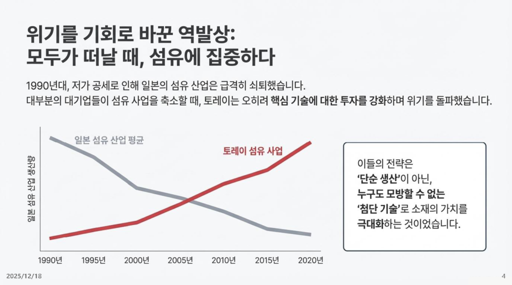 - 시사점: 남들이 섬유 산업이 사양길이라며 떠날 때, 토레이는 오히려 투자를 늘려 ‘나노 디자인(초미세 공정)’ 기술을 완성했습니다. 당장의 이익이 줄어든다고 연구비를 깎는 것은 미래의 먹거리를 포기하는 것과 같습니다.