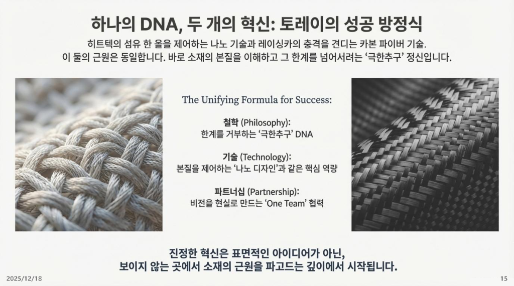 가성비 좋은 제품을 빨리 만드는 시대는 지났습니다. 이제는 토레이의 ‘극한추구’ 정신처럼, 남들이 흉내 낼 수 없는 ‘대체 불가능한 기술’을 가진 기업만이 살아남습니다.